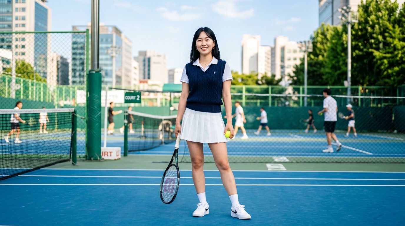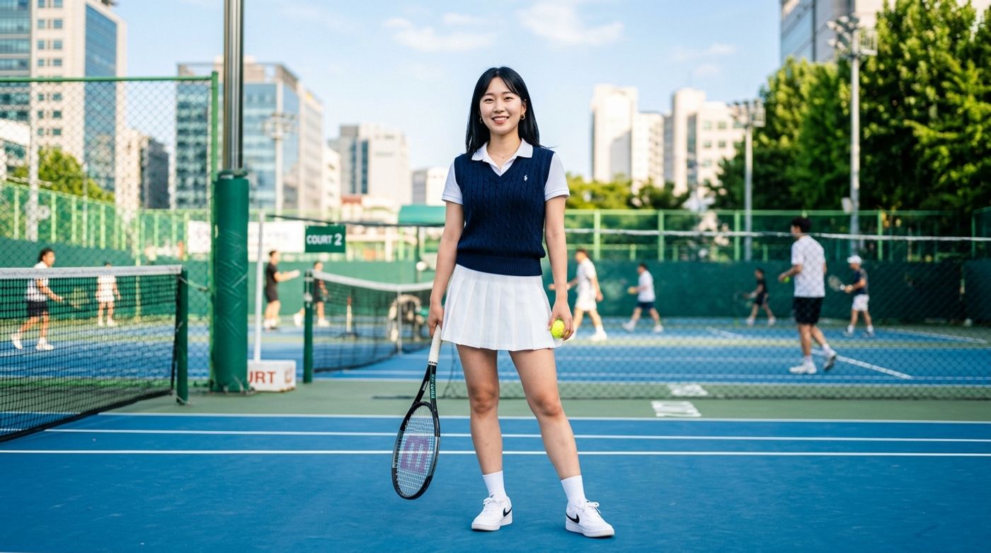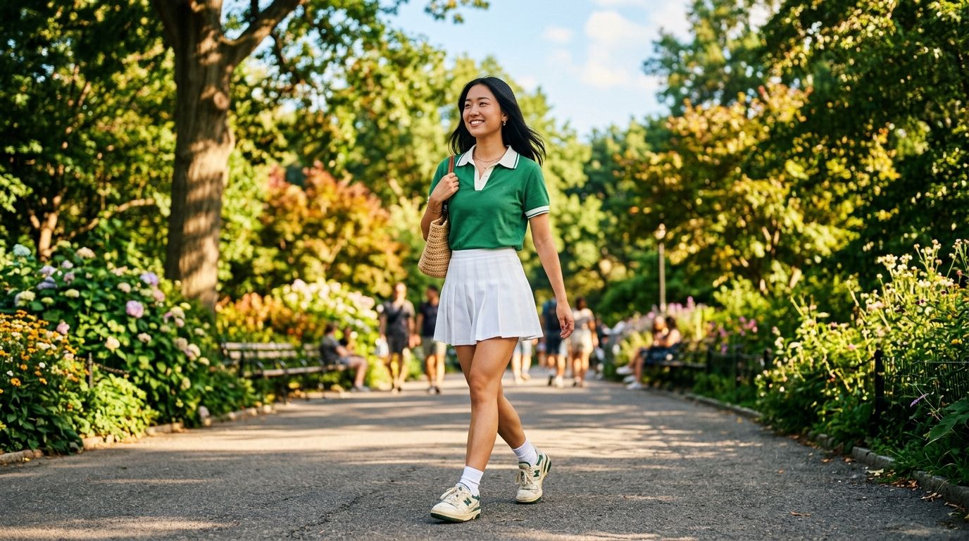 Le "Tenniscore", c'est quoi ? En gros, c'est piquer les codes des joueuses de tennis des années 90 pour les porter dans la vraie vie. On oublie la raquette, mais on garde tout le reste ! C'est la tendance parfaite pour la mi-saison parce qu'elle est légère et super facile à accessoiriser. Ce qui rend ce style canon, c'est le contraste : c'est à la fois très féminin avec la jupe et un peu "preppy" (comprendre : un style BCBG inspiré des uniformes scolaires américains) avec le pull sans manches.
