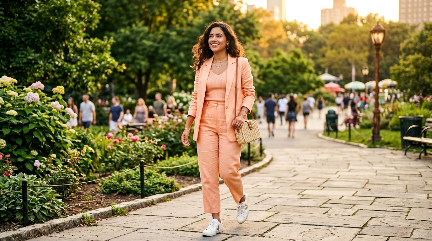 Si tu te sens d'humeur audacieuse, tente le monochrome ! L'astuce pour ne pas avoir l'air déguisée, c'est de jouer avec les matières. Combine un haut en soie pêche avec un pantalon en lin un peu plus mat. Le mélange de textures apporte de la profondeur à ta tenue et rend le look tout de suite plus sophistiqué.