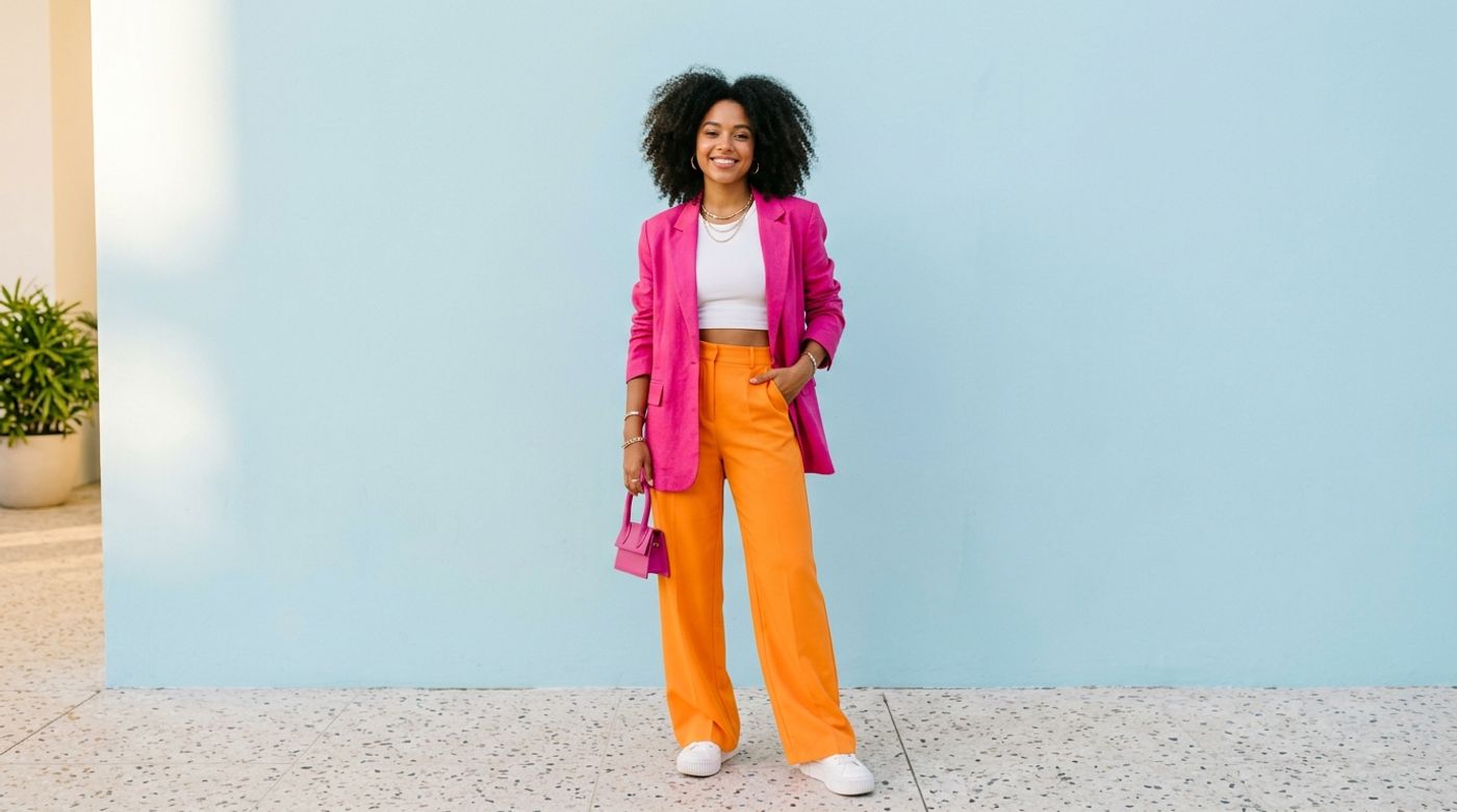 Pas besoin de refaire toute ton armoire. Regarde ce que tu as déjà. Le mélange rose fuchsia et orange ? C’est le combo star de la saison. Tu peux aussi tenter le bleu électrique avec du rouge : c'est audacieux, très mode et ça ne passe jamais inaperçu.